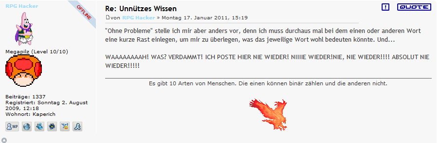 | RPG-Hacker 1337 | Ach Markus... | 20.01.2011 16:16:13 | Dominik | Ansehen |